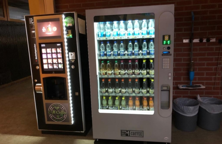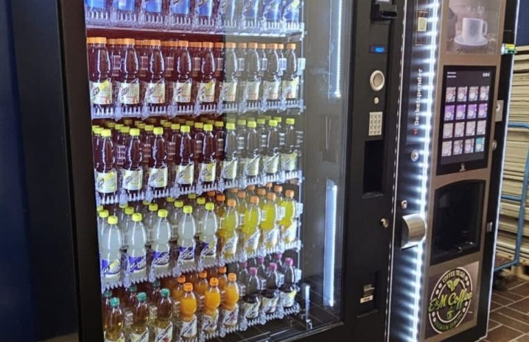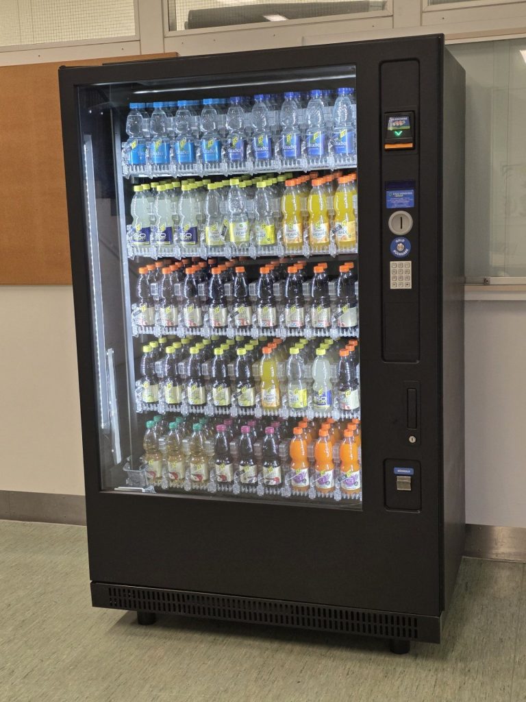 "Vendo G-Dink" ist ein Getränkeautomat, der sich durch eine besondere Ausgabe mit einem Roboterarm auszeichnet, der das Produkt schonend aus dem Fach holt und so einen "Fallmoment" vermeidet.